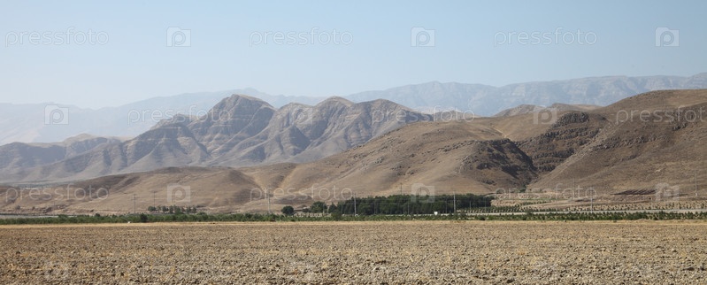 Гора Маркау возле Ашхабада с засушливой долиной, сухими холмами и редкими деревьями под чистым голубым небом