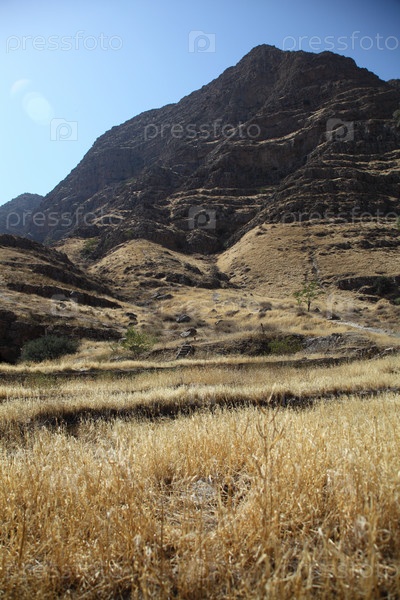 Гора Маркау возле Ашхабада с засушливой долиной, сухими холмами и редкими деревьями под чистым голубым небом