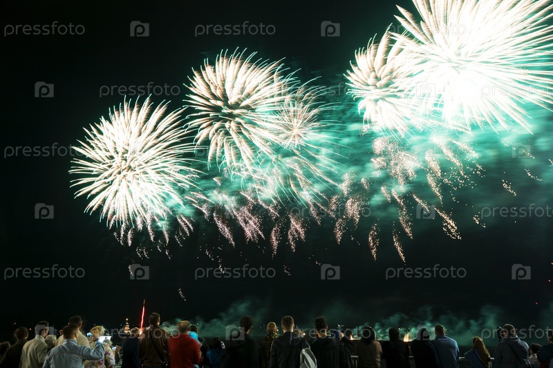 Фейерверк над набережной с толпой, наблюдающей за ночным праздником, длительным освещением световых путей и праздничной атмосферой