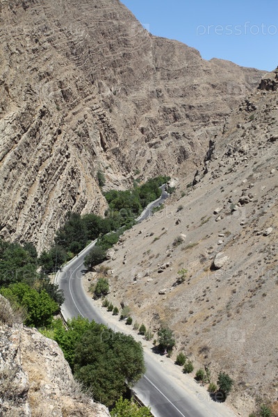 Горная дорога под шероховатыми засушливыми склонами возле горы Маркау в Ашхабаде, Туркменистан