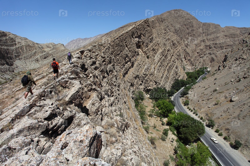 Горная дорога под шероховатыми засушливыми склонами возле горы Маркау в Ашхабаде, Туркменистан