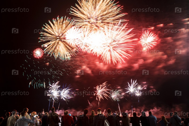 Фейерверк над набережной с толпой, наблюдающей за ночным праздником, длительным освещением световых путей и праздничной атмосферой