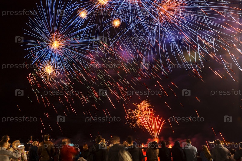 Фейерверк над набережной с толпой, наблюдающей за ночным праздником, длительным освещением световых путей и праздничной атмосферой