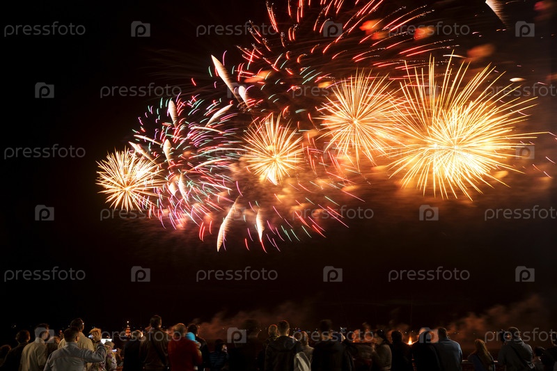 Фейерверк над набережной с толпой, наблюдающей за ночным праздником, длительным освещением световых путей и праздничной атмосферой