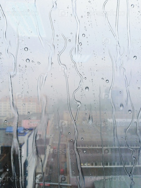 Капли дождя и полосы воды на стекле окна с размытыми зданиями города на заднем плане, абстрактное городское погодное настроение