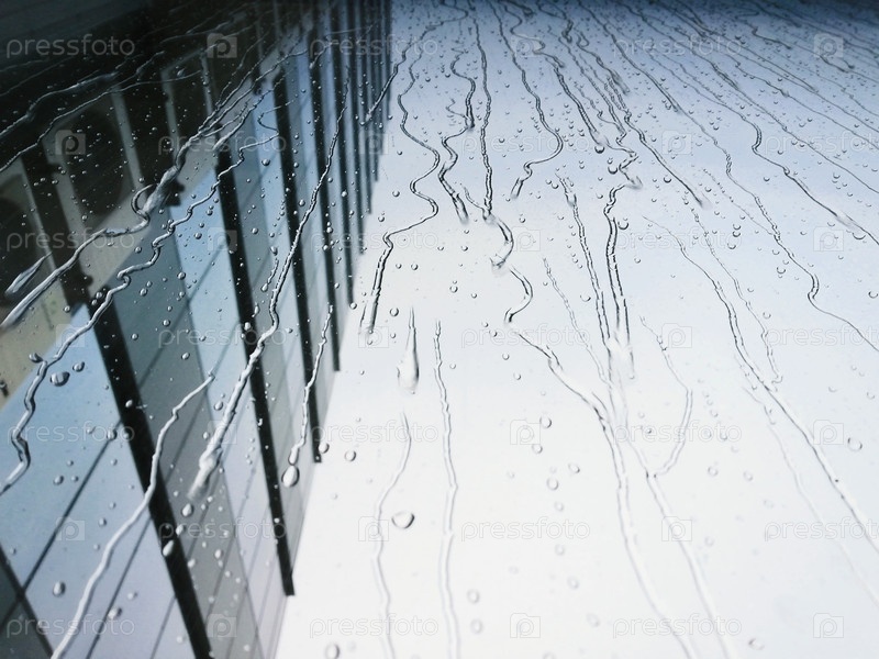 Капли дождя и полосы воды на стекле окна с размытыми зданиями города на заднем плане, абстрактное городское погодное настроение