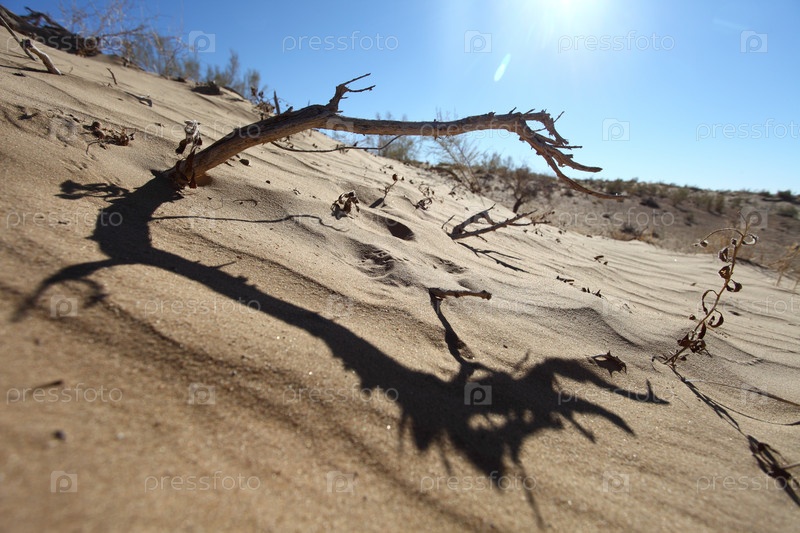 Скульптурные ветром пустынные дюны с волнистым песком и редкой травой под голубым небом