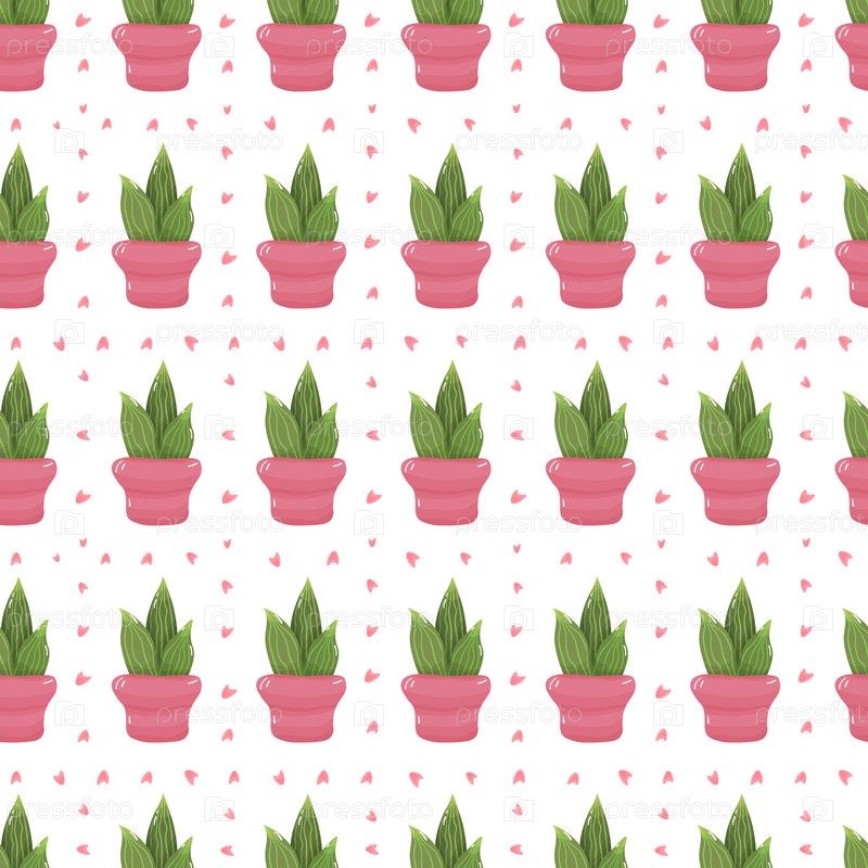 Бесшовный рисунок с мультфильмом комнатного растения в горшке - милый зеленый кактус со шипами в розовом горшке на белом фоне