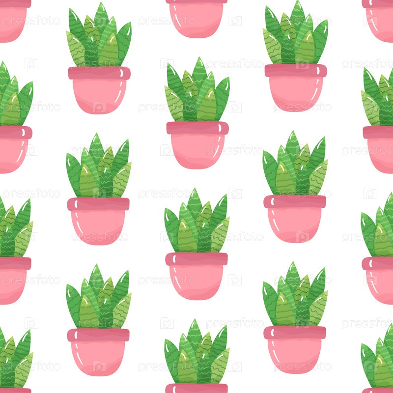 Бесшовный рисунок с мультфильмом комнатного растения в горшке - милый зеленый кактус со шипами в розовом горшке на белом фоне