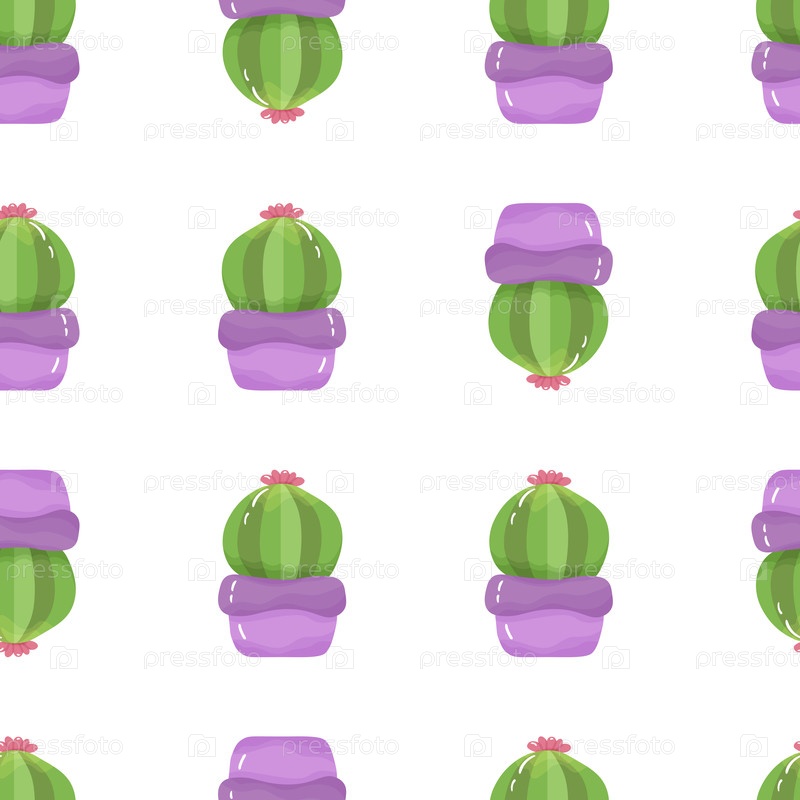 Бесшовный рисунок с мультфильмом комнатного растения в горшке - милый зеленый кактус с цветком и шипами в фиолетовом горшочке на белом фоне