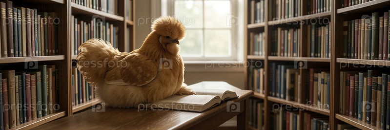 Курица, сидящая на книге в уютной библиотеке