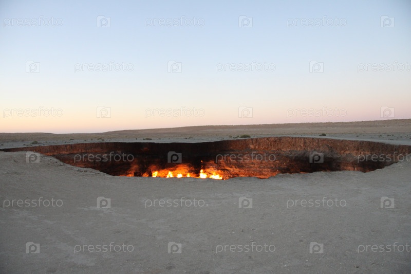 Горящий газовый кратер в пустыне на закате, известный как Дарваза-дверь ада в Туркменистане