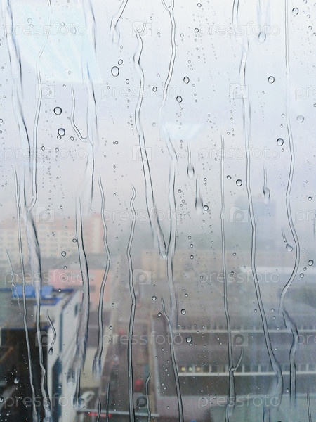 Капли дождя и полосы воды на стекле окна с размытыми зданиями города на заднем плане, абстрактное городское погодное настроение
