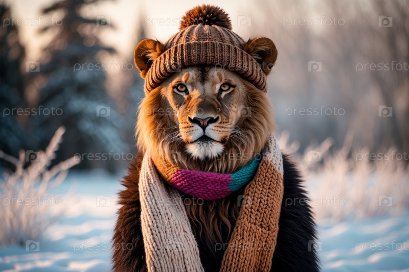 ИИ генеративный портрет льва в вязанной зимней одежде шляпа и шарф, животное во снежном снегу зимой