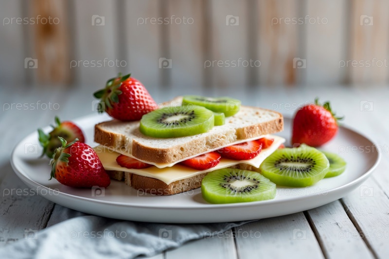 Generative AI Классический здоровый вегетарианский бутерброд на завтрак тост с сыром, фруктами киви и клубниками