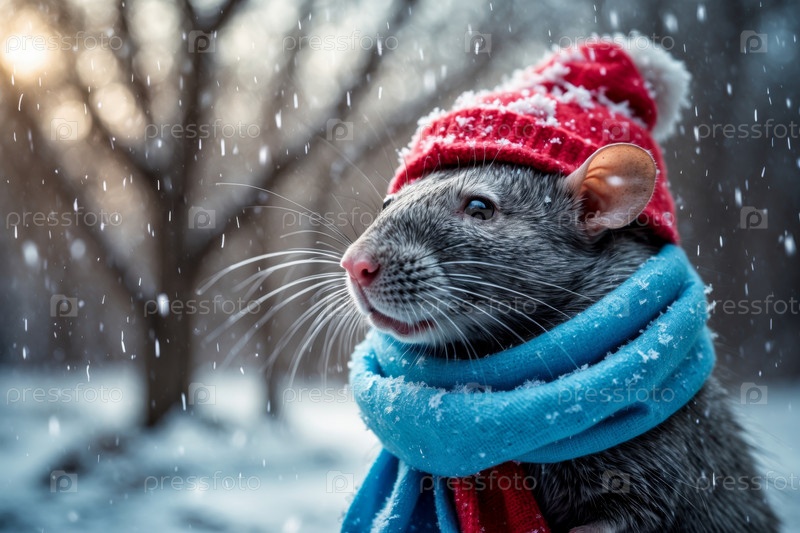 AI Generative Rat mouse portrait в вязанной зимней одежде шляпе и шарфе, животное под снежным дождём зимой