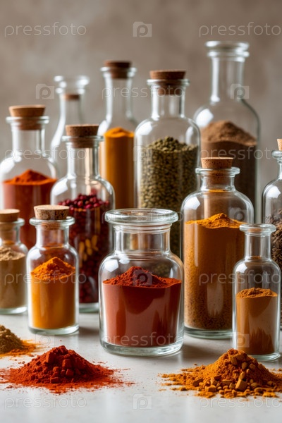 AI Generative Различные многие ароматические вкусы сухие специи порошковые кучи ассортимент в стеклянных банках миски