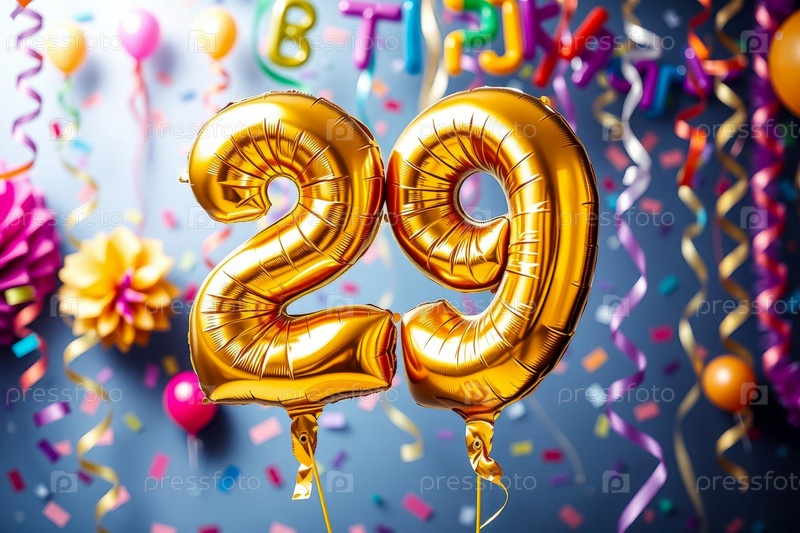 Гелийный день рождения шарик формы номер двадцать девять, золотая буква фигура 29 праздник праздничный фон