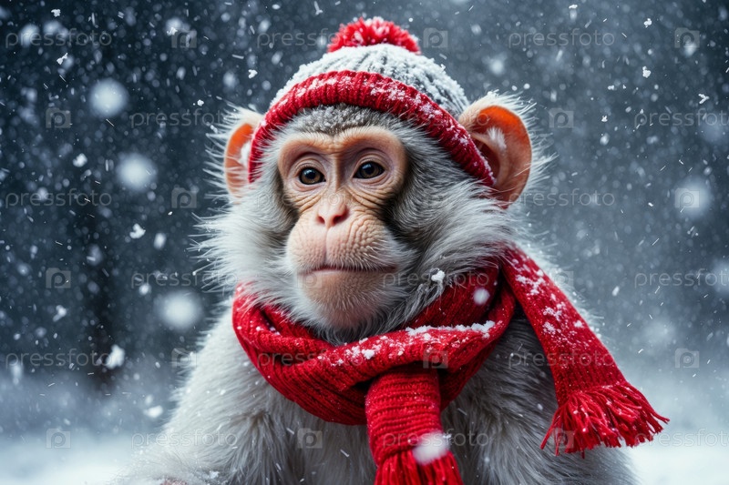 Портрет обезьяны в вязанной зимней одежде шляпы и шарфа, животное в снежных дождях зимой AI Generative
