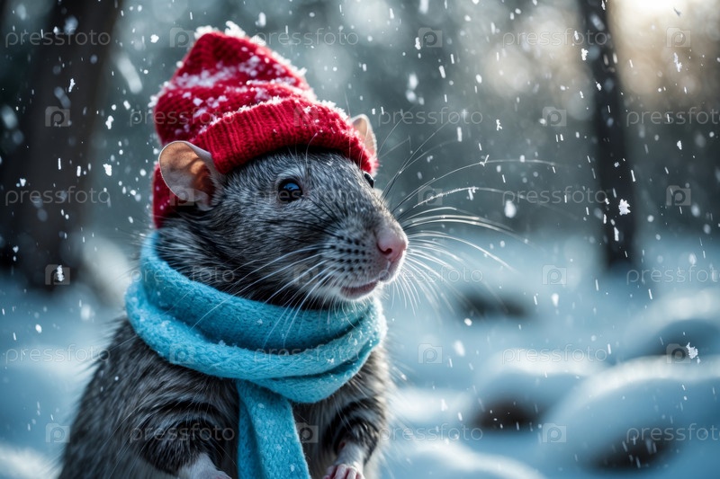 AI Generative Rat mouse portrait в вязанной зимней одежде шляпе и шарфе, животное под снежным дождём зимой