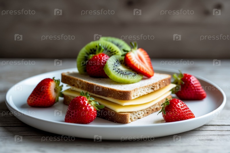 Generative AI Классический здоровый вегетарианский бутерброд на завтрак тост с сыром, фруктами киви и клубниками