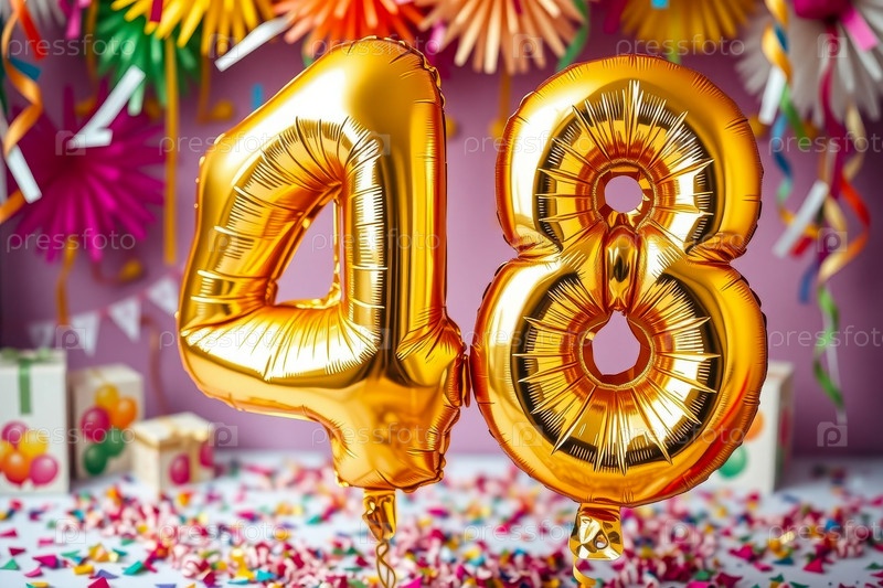 Гелий день рождения воздушный шар номер сорок восемь, золотые буквы фигура 48 праздник праздничный фон