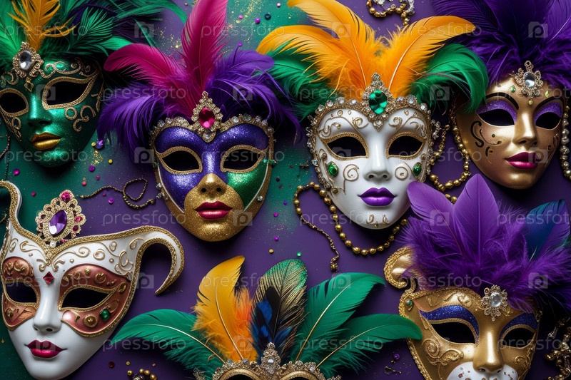 ИИ генеративные красочные карнавальные маски, праздничная традиция Марди-Грас Фестиваль Парадный парад На заднем плане
