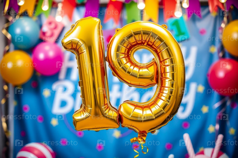Гелиевый баллон на день рождения в форме числа девятнадцать, фигура золотой буквы 19 на фоне праздничного торжества