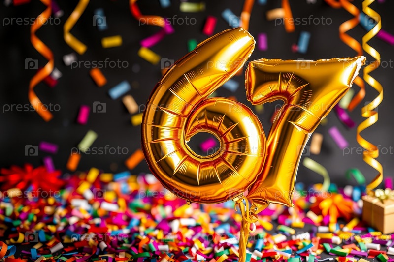 Гелий день рождения воздушный шар номер шестьдесят семь, фигура золотой буквы 67 праздник праздничный фон