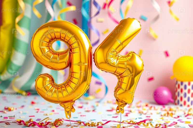 Гелий день рождения воздушный шар формы номер девяносто четыре, золотые буквы фигура 94 праздник праздничный фон декор