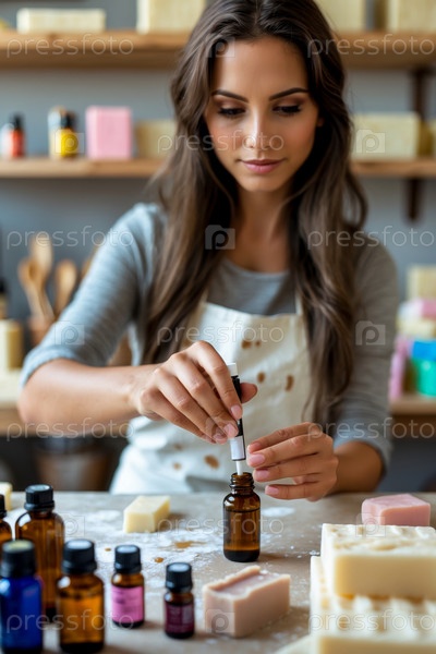Woman soap maker makes handmade natural organic aromatic cosmetic bar piece foam AI Generative Женщина, делающая мыло из натурального органического ароматического косметического штриха с пеной