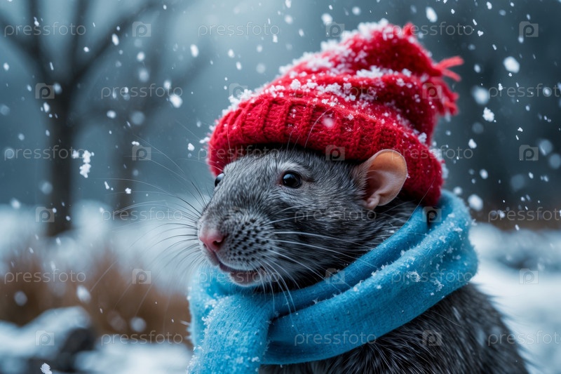 AI Generative Rat mouse portrait в вязанной зимней одежде шляпе и шарфе, животное под снежным дождём зимой