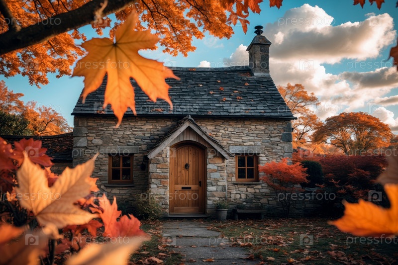 Дом здания ландшафтный фон красные и желтые листья осень-осень осенний лесной парк AI Generative