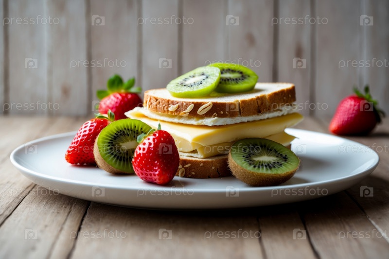 Generative AI Классический здоровый вегетарианский бутерброд на завтрак тост с сыром, фруктами киви и клубниками