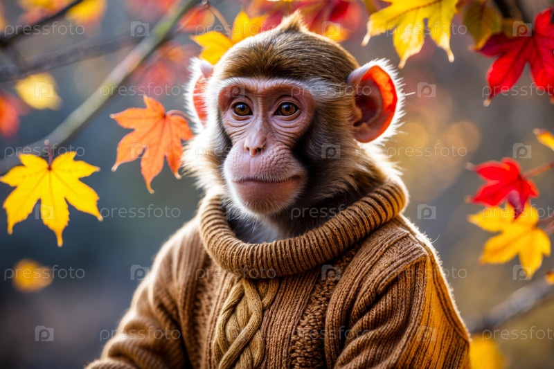 Обезьяна в трикотажном свитере осенний лесный фон, животное в красно-желтых листьях AI Generative