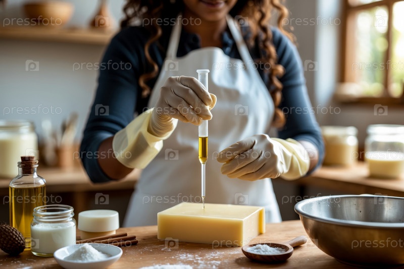Woman soap maker makes handmade natural organic aromatic cosmetic bar piece foam AI Generative Женщина, делающая мыло из натурального органического ароматического косметического штриха с пеной