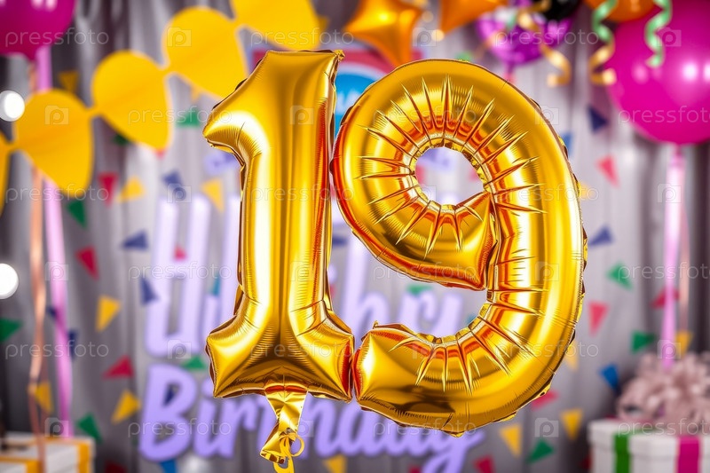Гелиевый баллон на день рождения в форме числа девятнадцать, фигура золотой буквы 19 на фоне праздничного торжества
