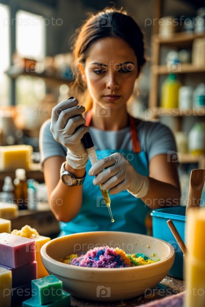 Woman soap maker makes handmade natural organic aromatic cosmetic bar piece foam AI Generative Женщина, делающая мыло из натурального органического ароматического косметического штриха с пеной