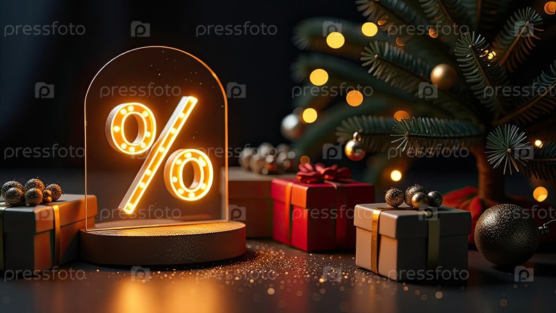 Неон светящийся золотой процентный знак на рождественском фоне с елкой, блесками и коробками для подарков. витрина магазина в Черную пятницу, Новый год, Рождественская распродажа, скидки. баннер, флаер. ИИ генерируется