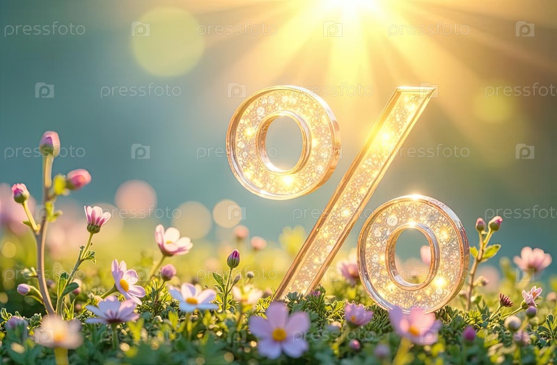 Золотой прозрачный процентный знак в солнечных лучах, украшен весенними пастельными цветами.Весенняя распродажа и скидки, 8 марта, Пасха, баннер женского дня, флаер с копировальным пространством. ИИ генерируется