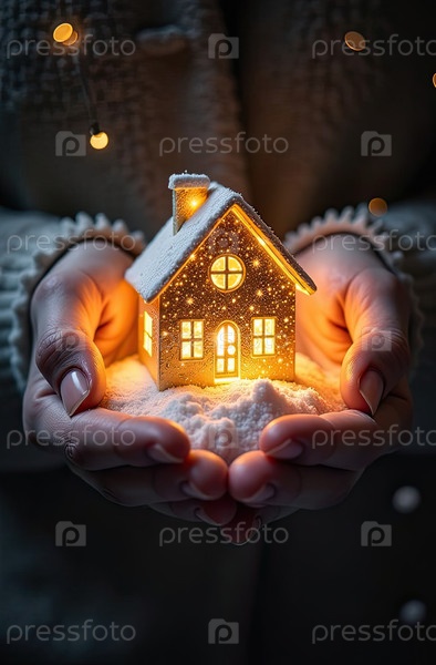 Золото светящийся символ уютного дома на снегу В ладонях рук с золотым блеском. Недвижимость, риэлтор, ипотека, страхование, бронирование, зимовка, изоляция, отопление. ИИ генерируется