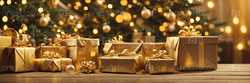 Рождественский фон с подарочными коробками с луками в ярких золотых тонах, боке и фейри-светом, рождественская елка во внутреннем интерьере дома. праздничное настроение Рождество и Новый год, баннер. ИИ генерируется