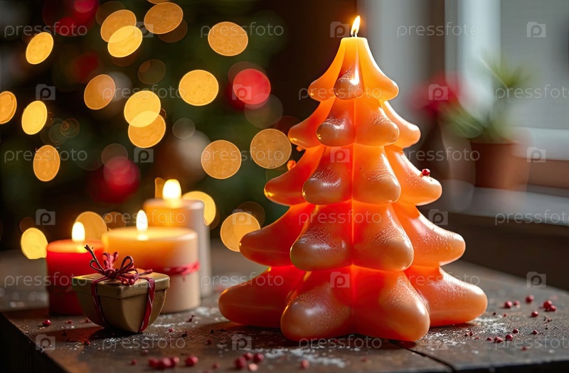 Ручная свеча в форме елки на рождественском фоне. Подарок, подарок, ремесло для Нового года и новогоднего подарка. Хоби-свечи и мыльное производство, домашнее изготовление. ИИ генерируется;