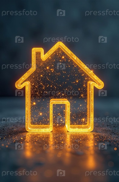 Прозрачное золото светящийся символ дома на сером бетонном фоне с золотым блеском. недвижимость, риэлтор, ипотека, страхование, бронирование, строительство, изоляция, отопление. ИИ генерируется