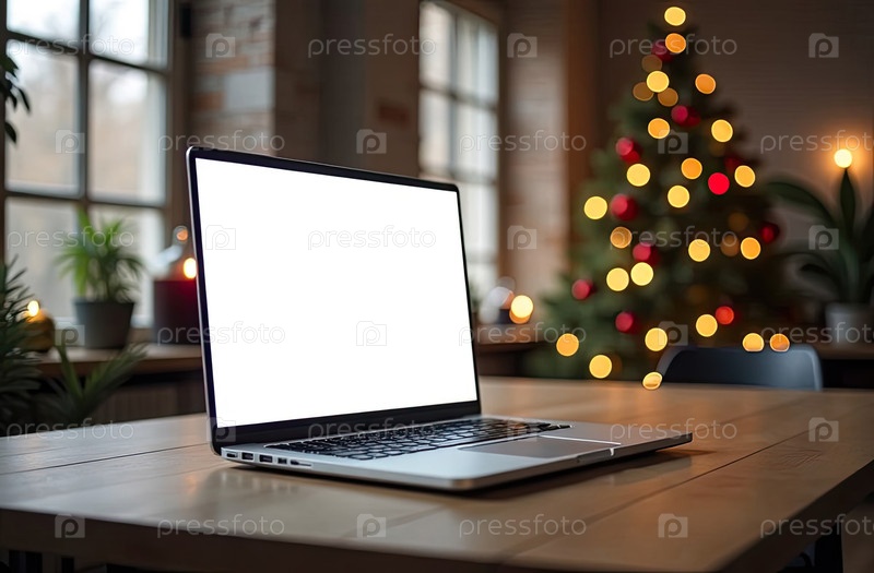 Ноутбук с белым экраном макет на столе в уютном кафе в стиле лофт со стаканом кофе, домашний офис рождественского декора