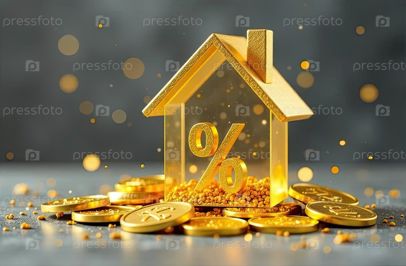 Золото светящийся символ процент в доме на стеке золотых монет на сером бетонном фоне. строительство жилья, скидка, купон, покупка, продажа, риэлторская деятельность, ипотека, страхование, бронирование. AI generated