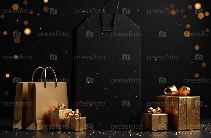Ценник с пространством для текста на черном фоне. Покупки и скидки, распродажа в Черную пятницу, сумки покупок, подарочная коробка. баннер, флаер. ИИ генерируется