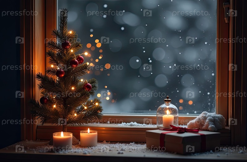 Внутреннее уютное окно с рождественским декором и теплыми световыми гирляндами и свечами - внутренний вид зимой и снегом со спасом для текста. Отпразднуйте Рождество и Новый год, елку, боке. ИИ генерируется
