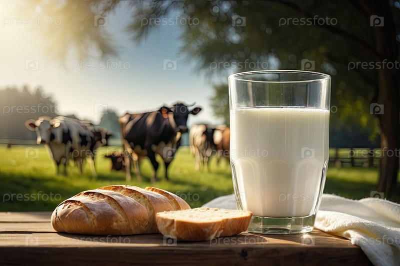 Свежее деревенское коровье молоко в кружке и белый ароматный хлеб и выпечка на столе на фоне луга, где пасутся коровы