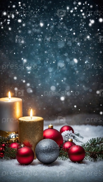 Рождественская открытка с кописпейсом на праздничном снежном фоне с елкой, рождественскими шарами, свечами, конусами и блеском